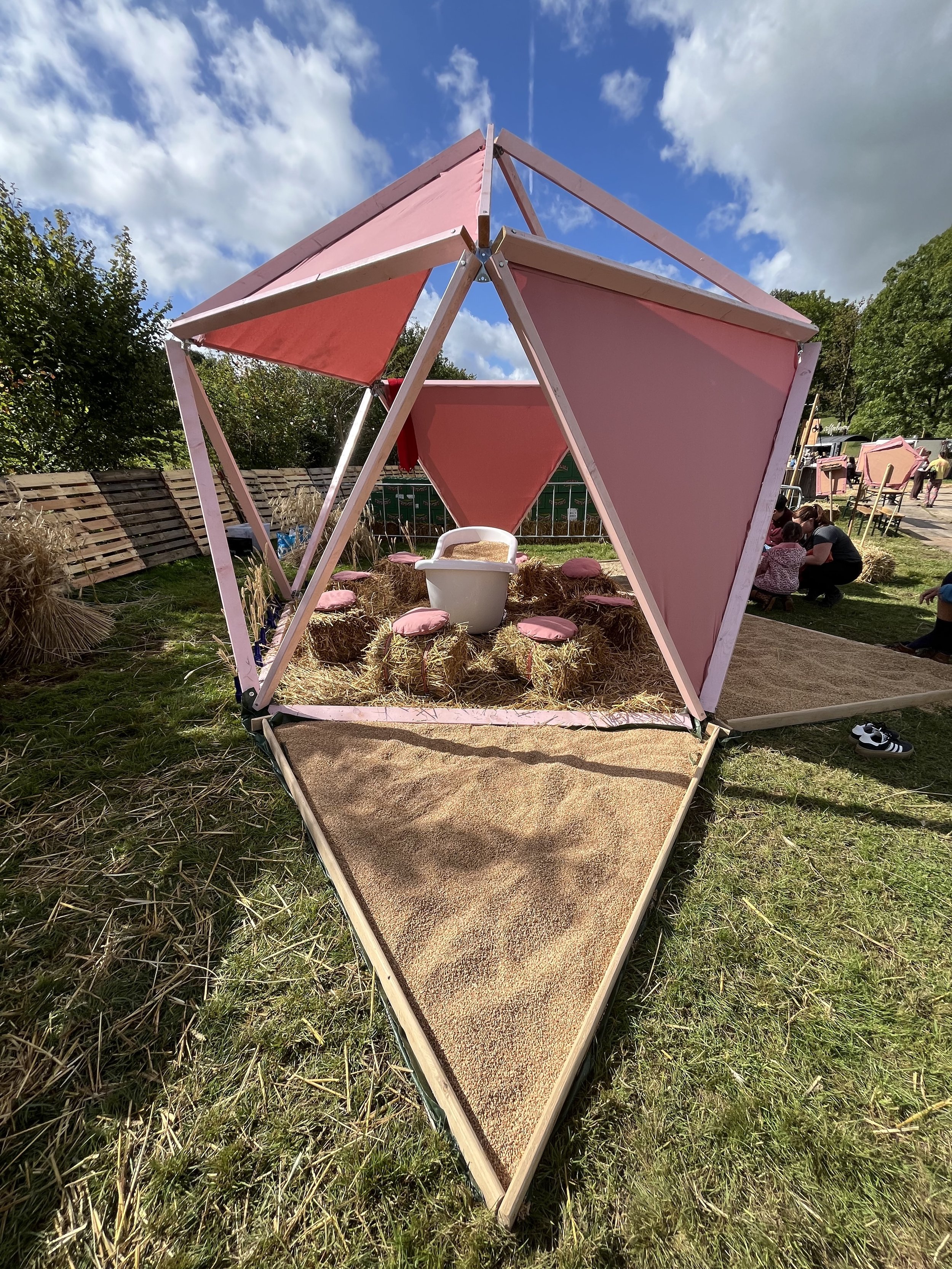 Het Voeltheater is een installatie dat uitnodigt om beter te voelen. Zo creëren we een andere context, met alledaagse producten. Een speeltuin die het ondeugende in onszelf opwekt en de sensualiteit vergroot. Dit doen we door de zintuigen te prikkelen met eten, bijvoorbeeld met graan zoals afgebeeld op de foto. (Het kan ook met andere producten.) Zo nodigen we bezoekers uit om mee te doen aan een of alle ervaringen. Dus met blote voeten over een graanpad lopen, geblinddoekt verschillende texturen ontdekken, luisteren naar een gedicht over graan, een proeverij van pure graankorrels.